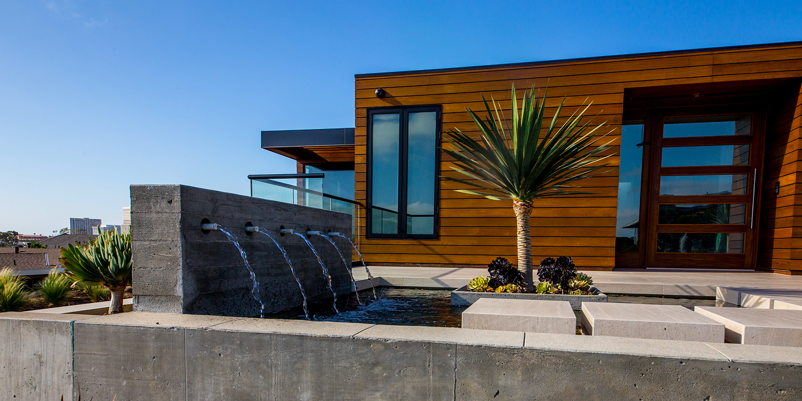 Eco-friendly and minimal, this rear yard boasts a sweeping view of the ocean and is prepared with an Ipe wood deck as well as a zero-edge pool and spa with cascading infinity edge fountain. Other